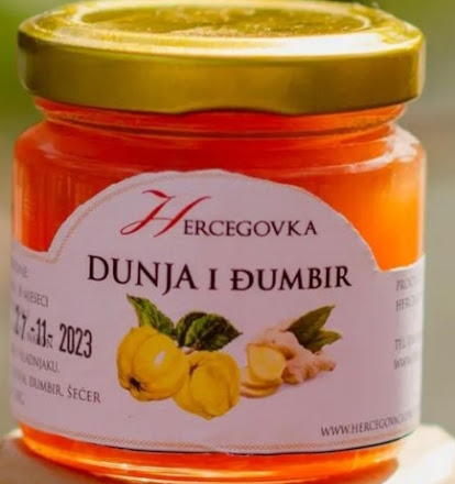 Domaći džem od dunje sa dodatkom đumbira bez konzervansa, dodataka i umjetnih boja. Pakovanja od 320 g i od 100 g